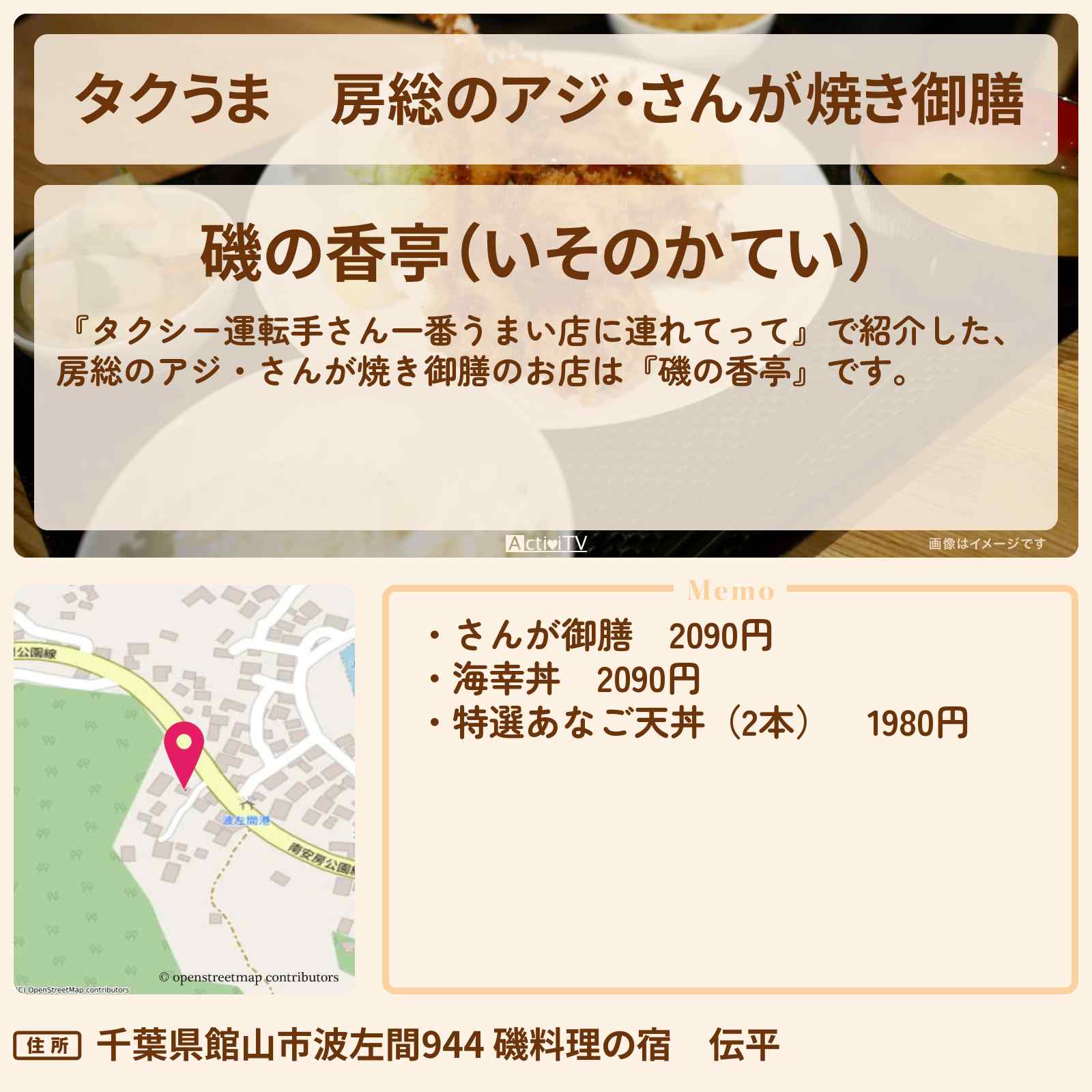 | 住所 | 千葉県館山市波左間944 磯料理の宿 伝平 |