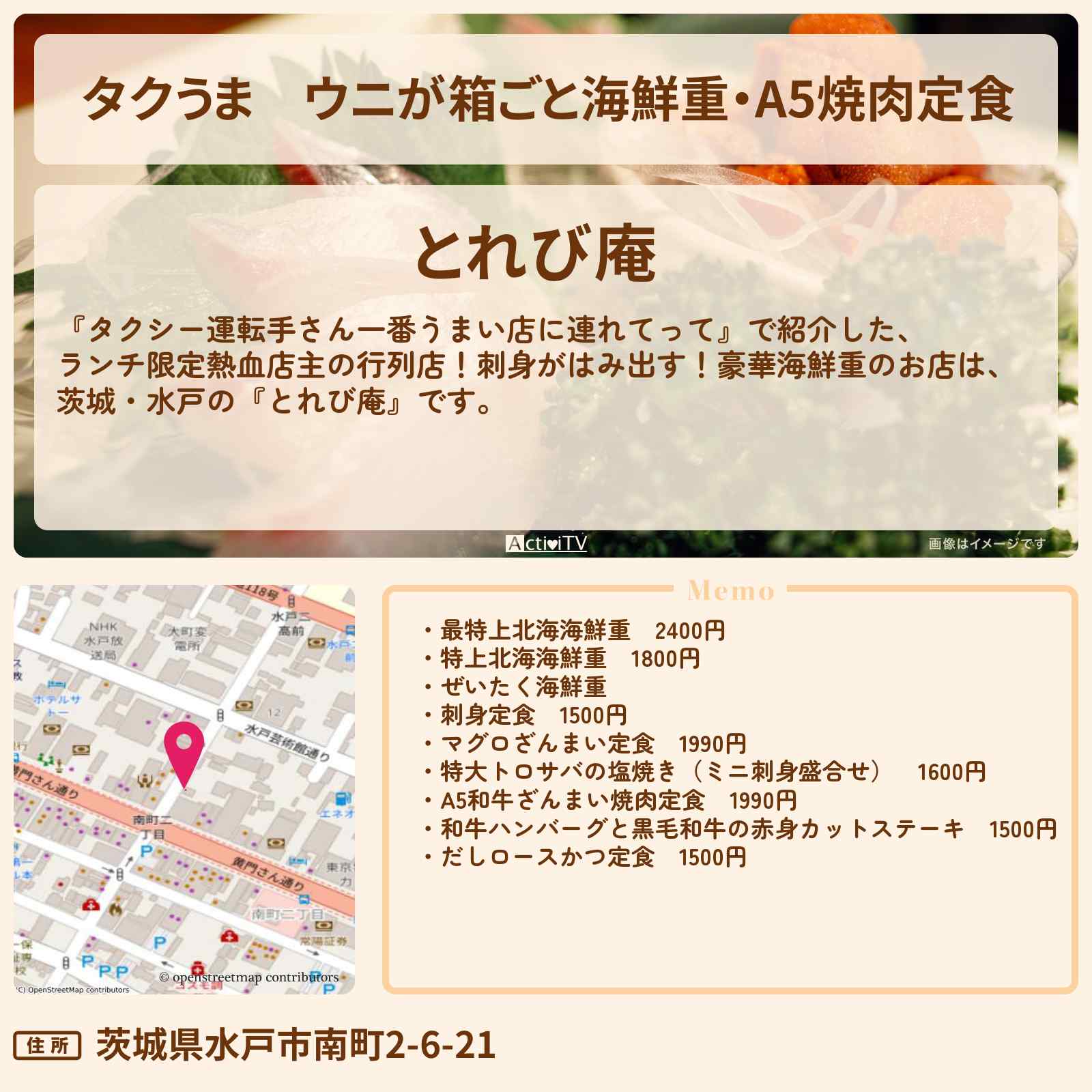 放送の【タクシー運転手さん一番うまい店に連れてって】で紹介した、ランチ限定熱血店主の行列店!刺身がはみ出す!豪華海鮮重のお店は、茨城・水戸の『とれび庵』です。