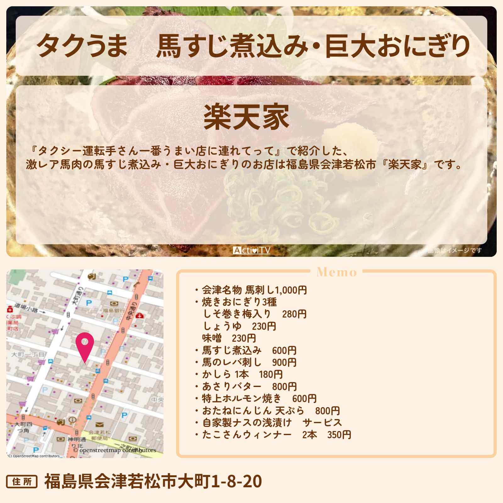 放送の【タクシー運転手さん一番うまい店に連れてって】で紹介した、激レア馬肉の馬すじ煮込み・巨大おにぎりのお店は福島県会津若松市『楽天家』です。