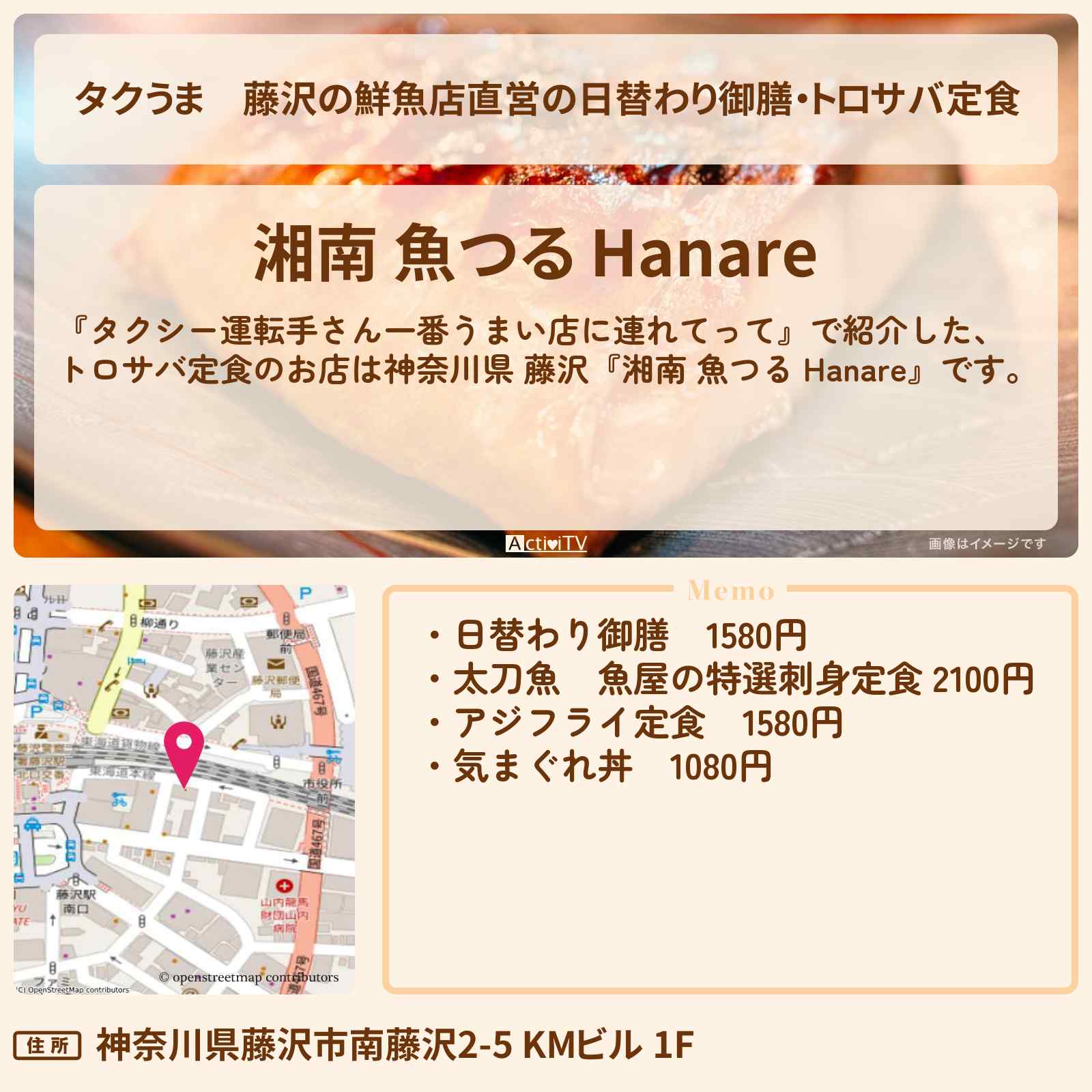 放送の【タクシー運転手さん一番うまい店に連れてって】で紹介した、トロサバ定食のお店は神奈川県 藤沢『湘南 魚つる Hanare』です。