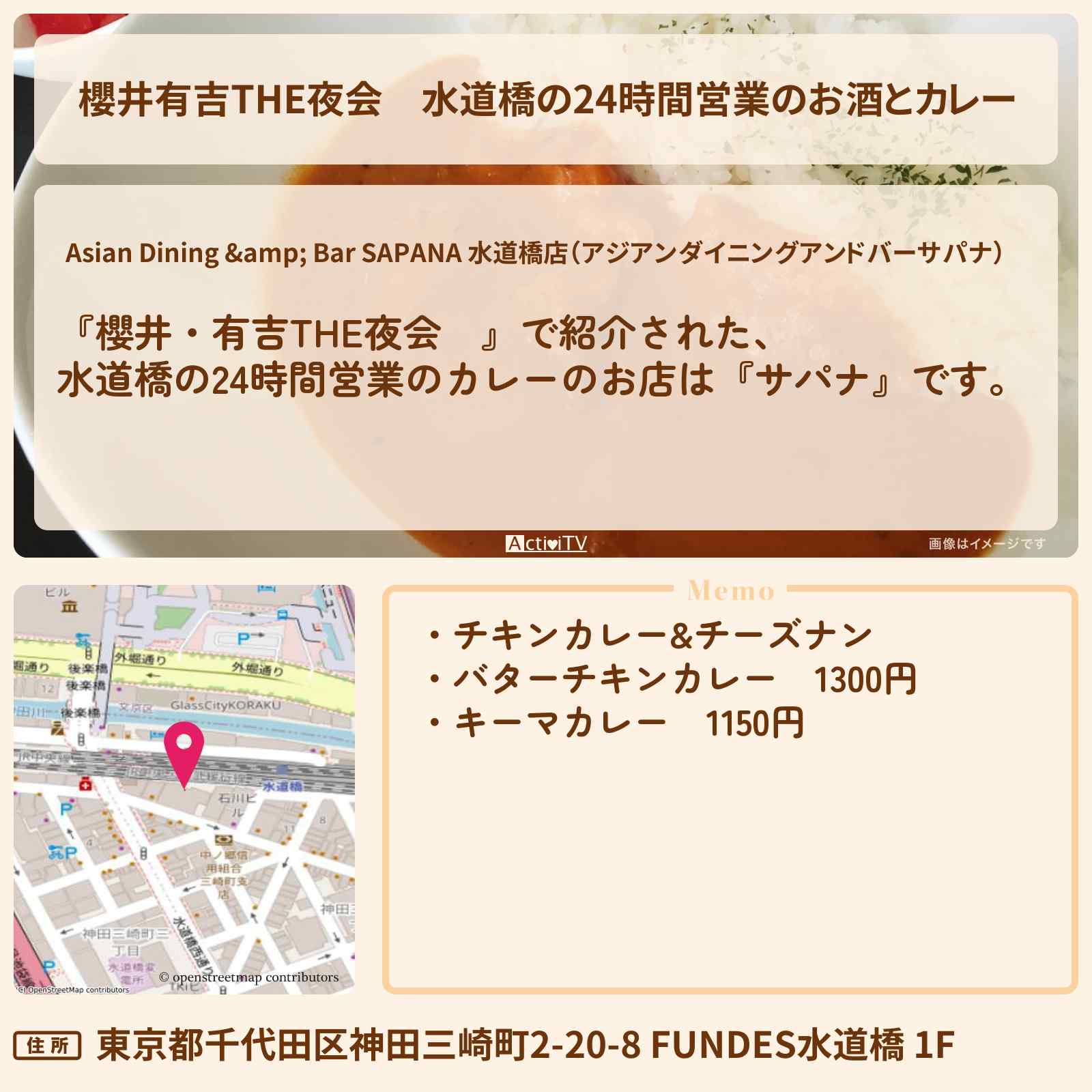 【櫻井有吉THE夜会】水道橋の24時間営業のお酒とカレー『サパナ』のお店の場所