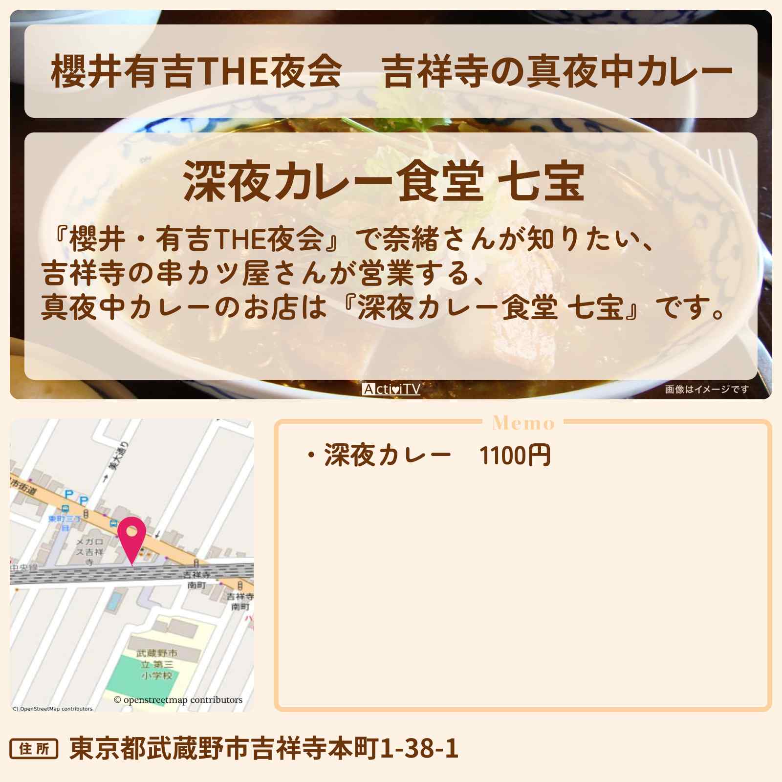 (木)放送の【櫻井・有吉THE夜会】で奈緒さんが知りたい、吉祥寺の串カツ屋さんが営業する、真夜中カレーのお店は『深夜カレー食堂 七宝』です。