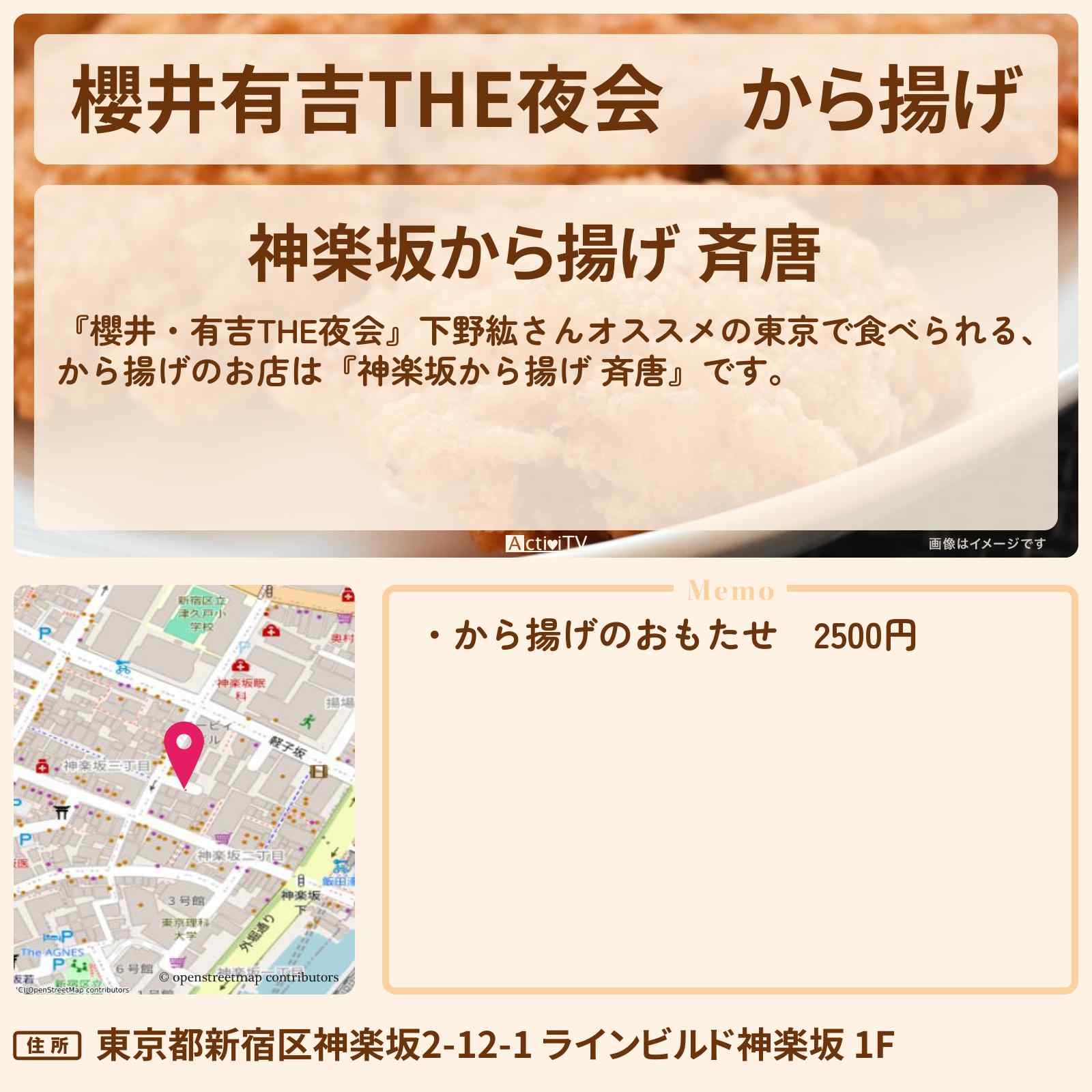 こちらは『神楽坂から揚げ 斉唐(神楽坂/からあげ)』のお店ページです。実名でのオススメが3件集まっています。Rettyで食が好きなグルメな人たちからお店を探そう!…