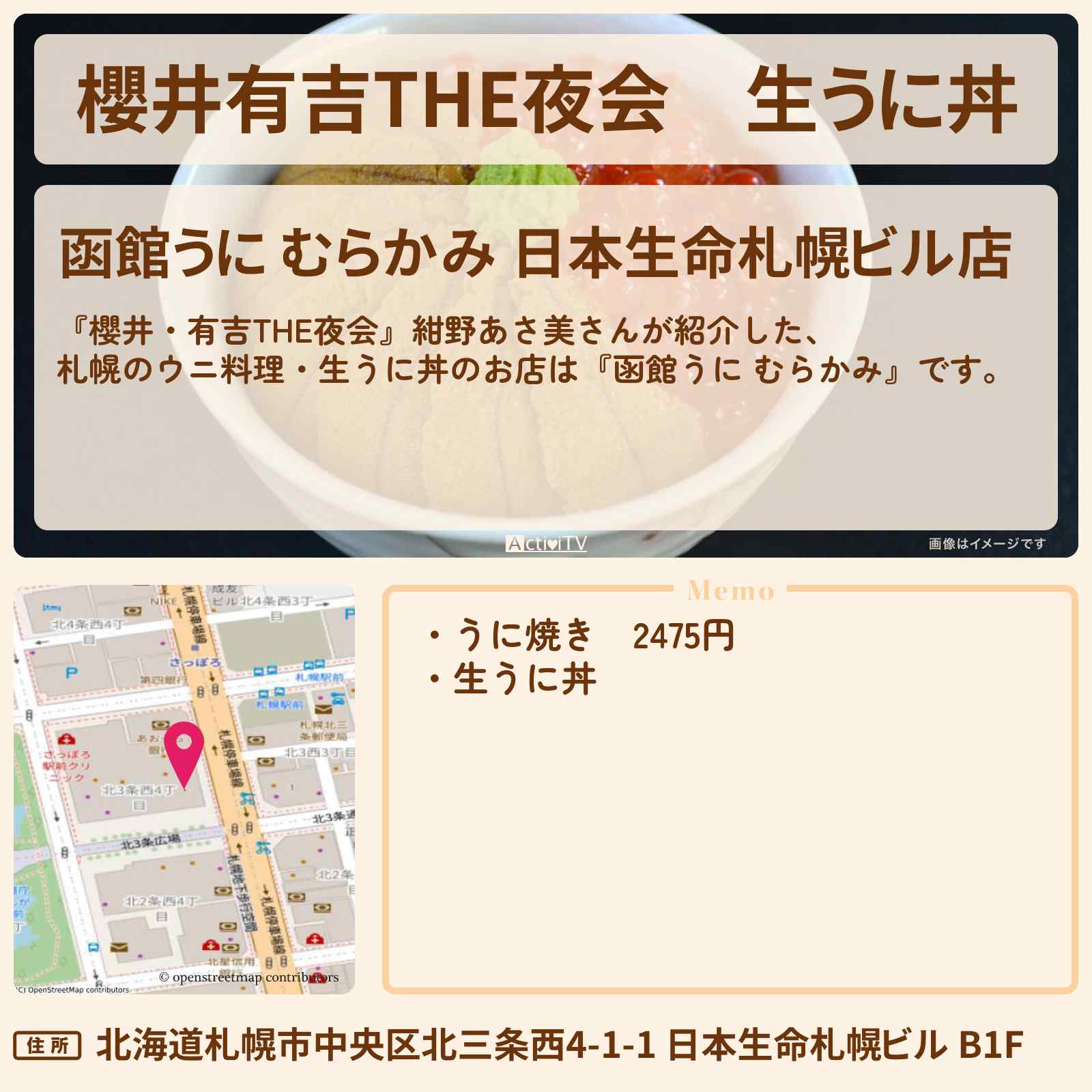 放送の【櫻井・有吉THE夜会】紺野あさ美さんが紹介した、札幌のウニ料理・生うに丼のお店は『函館うに むらかみ』です。