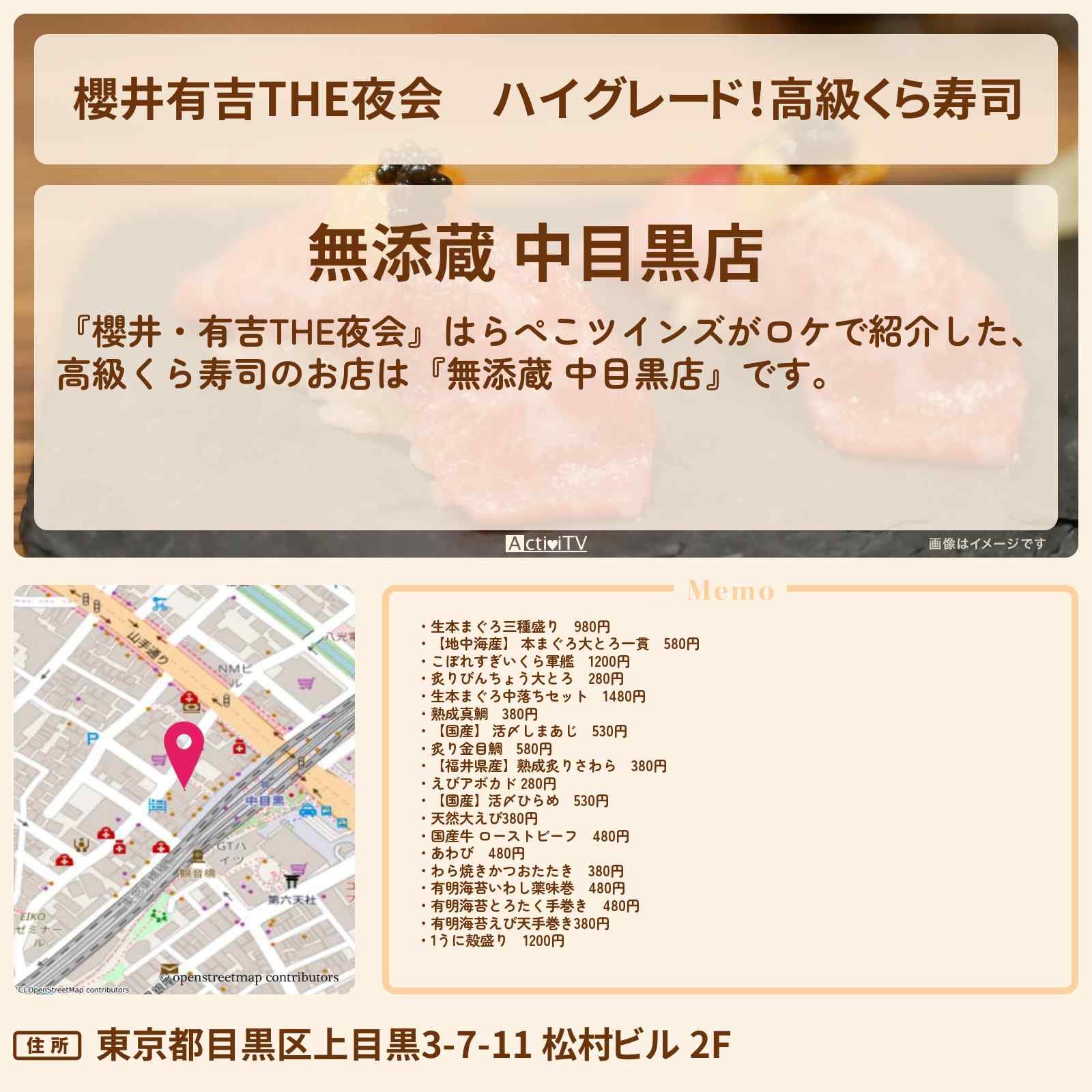 こちらは『無添蔵 中目黒店(中目黒/回転寿司)』のお店ページです。実名でのオススメが2件集まっています。Rettyで食が好きなグルメな人たちからお店を探そう!