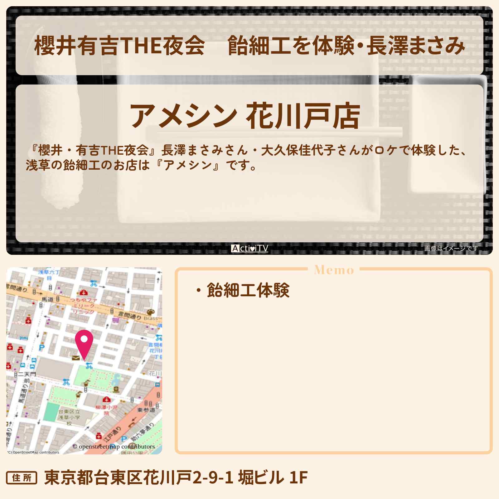 (木)放送の【櫻井・有吉THE夜会】長澤まさみさん・大久保佳代子さんがロケで体験した、浅草の飴細工のお店は『アメシン』です。