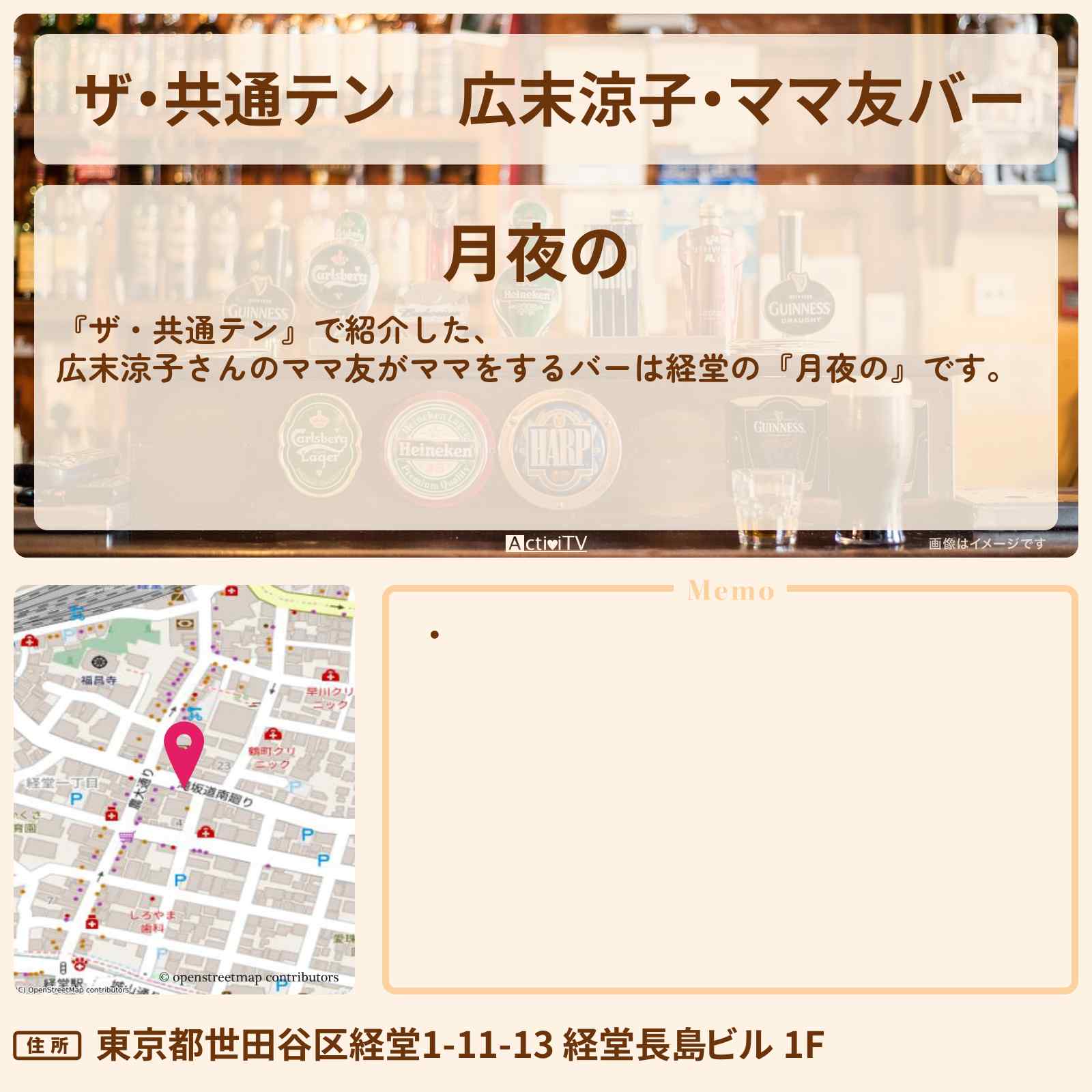放送の【ザ・共通テン】で紹介した、広末涼子さんのママ友がママをするバーは経堂の『月夜の』です。