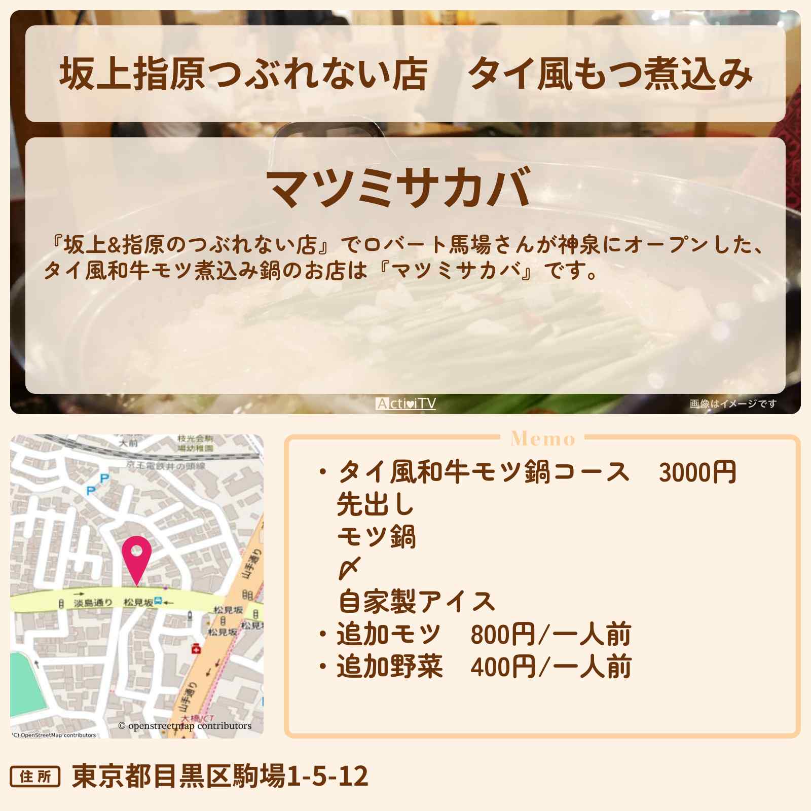 放送の【坂上&指原のつぶれない店】でロバート馬場さんが神泉にオープンした、タイ風和牛モツ煮込み鍋のお店は『マツミサカバ』です。