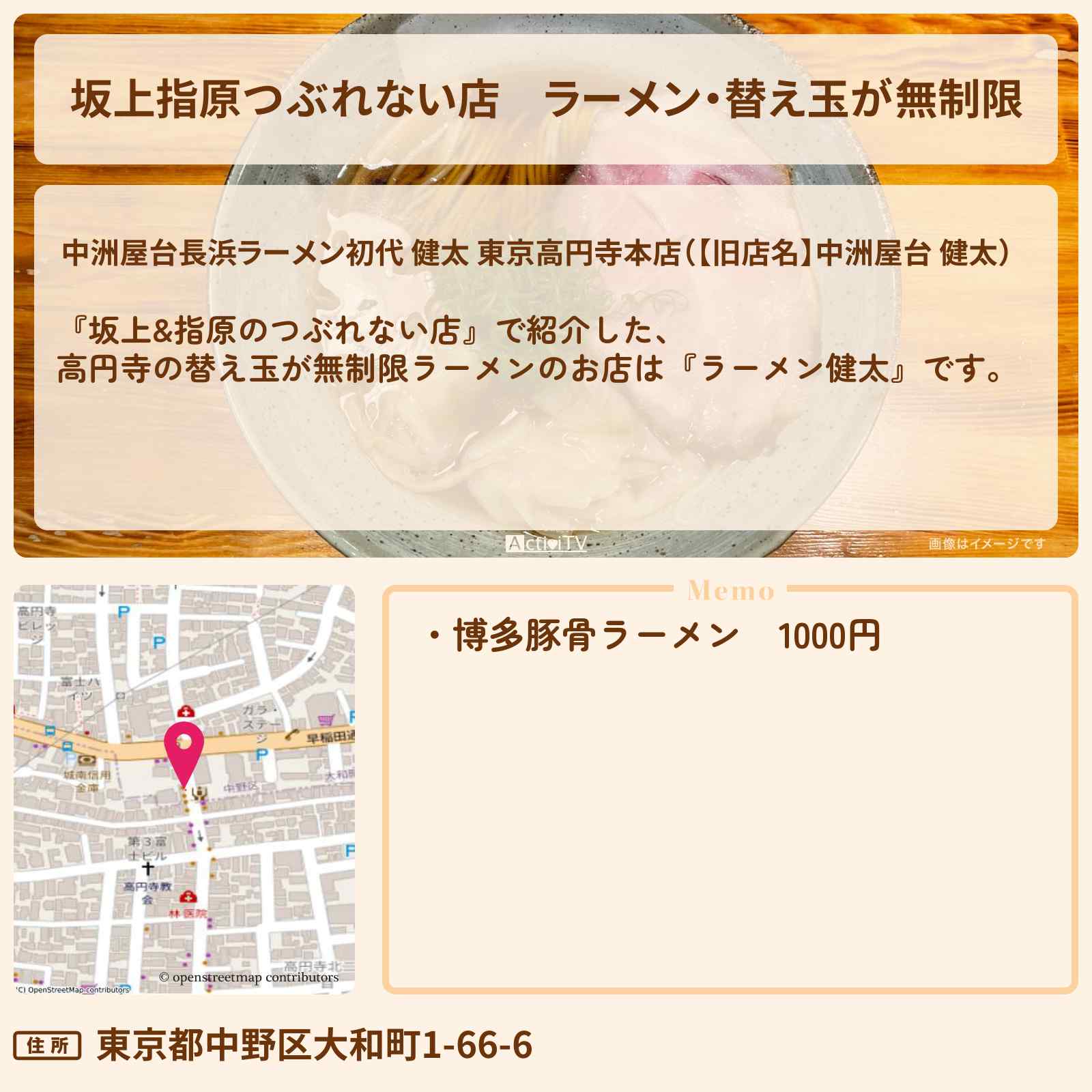 ラーメン・替え玉が無制限 高円寺駅「中洲屋台長浜ラーメン初代 健太 東京高円寺本店(【旧店名】中洲屋台 健太)」