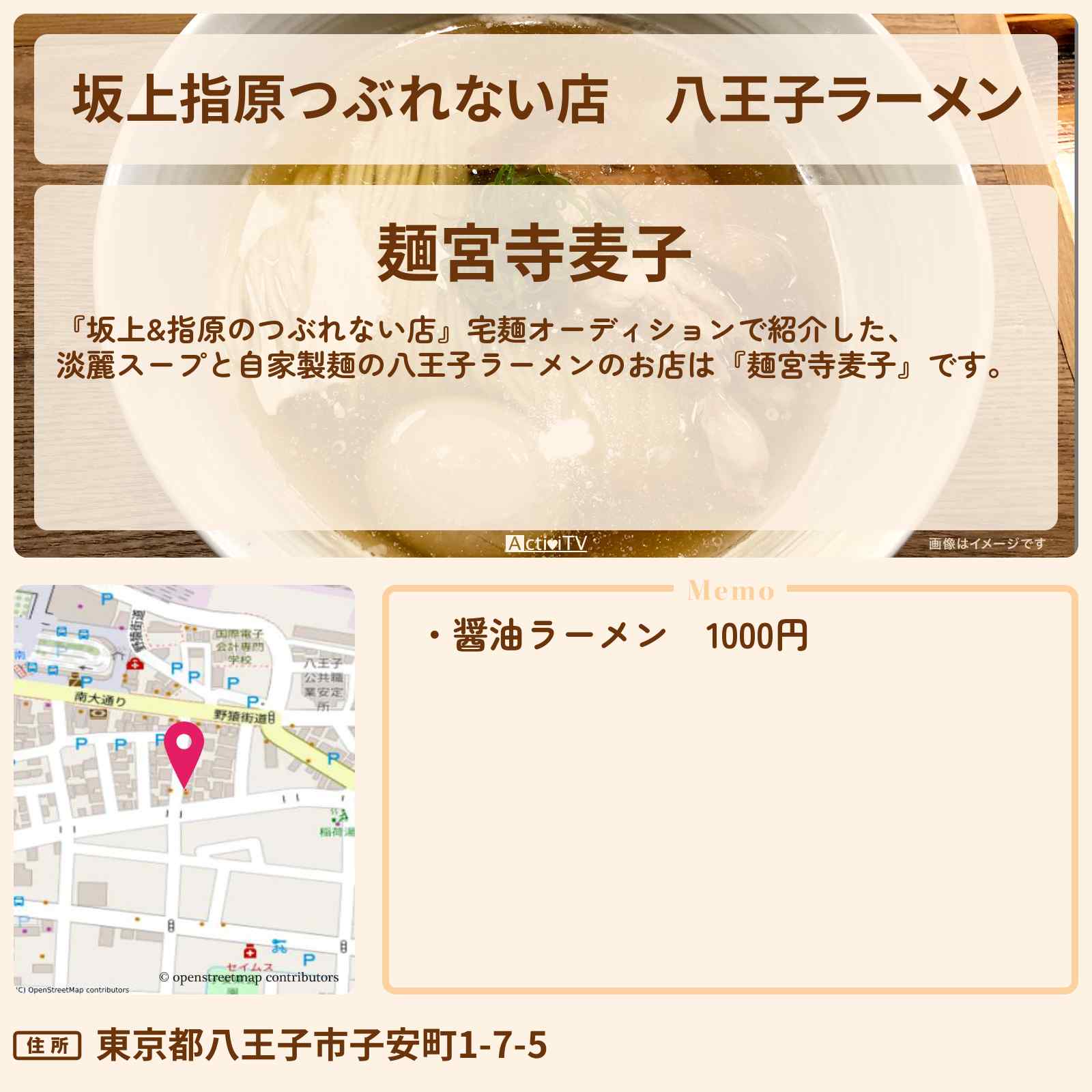 JR八王子駅南口から徒歩約4分という好立地に店を構える同店は、小料理屋「さちこ飯MESHI」の昼間の営業時間を利用して営業しています。店名の「麺宮寺麦子」は店主の妄想のキャラクターという、一風変わった由来を持つラーメン店です。
