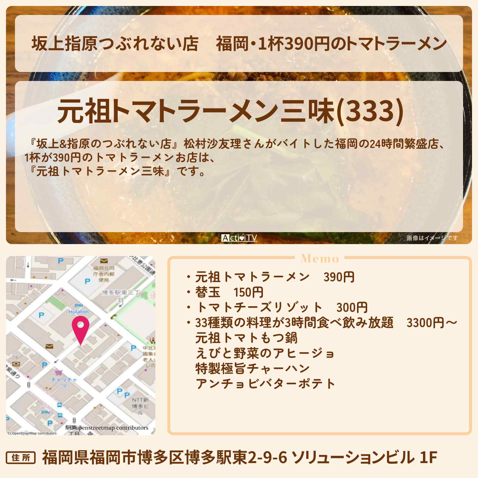 【ネット予約可】元祖トマトラーメン 三味 333 博多駅東店(居酒屋/和風)の予約なら、お得なクーポン満載、24時間ネット予約でポイントもたまる【ホットペッパーグルメ】!おすすめはNET予約でPOIN……
