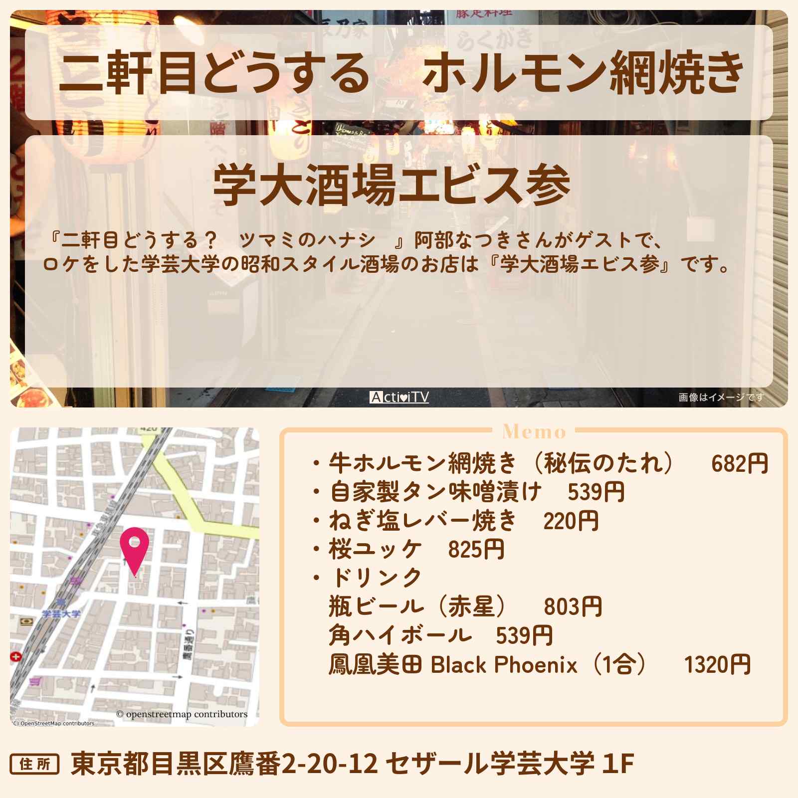 放送の【二軒目どうする?~ツマミのハナシ~】阿部なつきさんがゲストで、ロケをした学芸大学の昭和スタイル酒場のお店は『学大酒場エビス参』です。