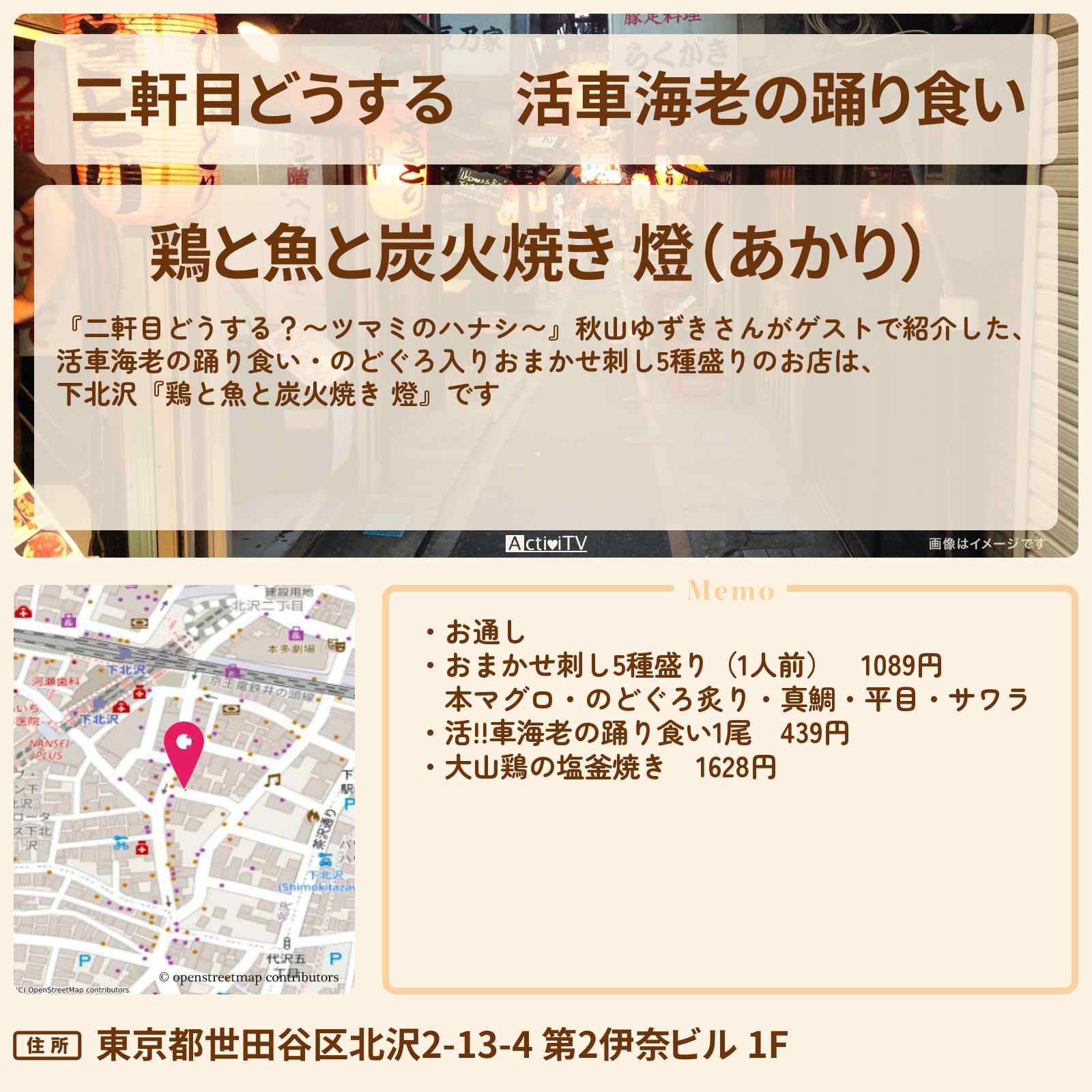 鶏と魚と炭火焼き 燈 あかり 下北沢(下北沢/居酒屋/和風)の店舗情報・予約なら、お得なクーポン満載【ホットペッパーグルメ】!鶏と魚と炭火焼き 燈 あかり 下北沢のおすすめポイントは、当店名物の「活き車エビの踊り食い」は、生け簀から取り出したばかりの新鮮なエビを味わえます! 下北沢燈で楽しむ『特上ウニ刺し』♪まるで獲れたてのような味わい!!ぜひ一度お試しください♪。鶏と魚と炭火焼き 燈 あかり 下北沢の地図、メニュー、口コミ、写真などグルメ情報満載です!…