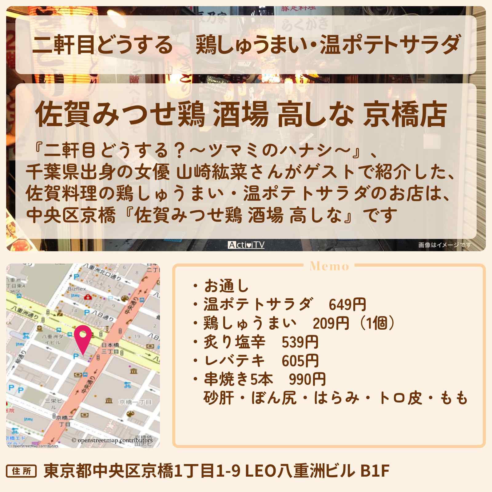 | 住所 | 東京都中央区京橋1丁目1-9 LEO八重洲ビル B1F |