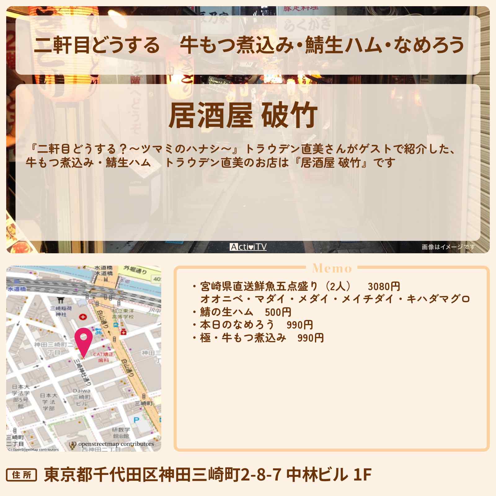 牛もつ煮込み・鯖生ハム 水道橋駅「居酒屋 破竹」