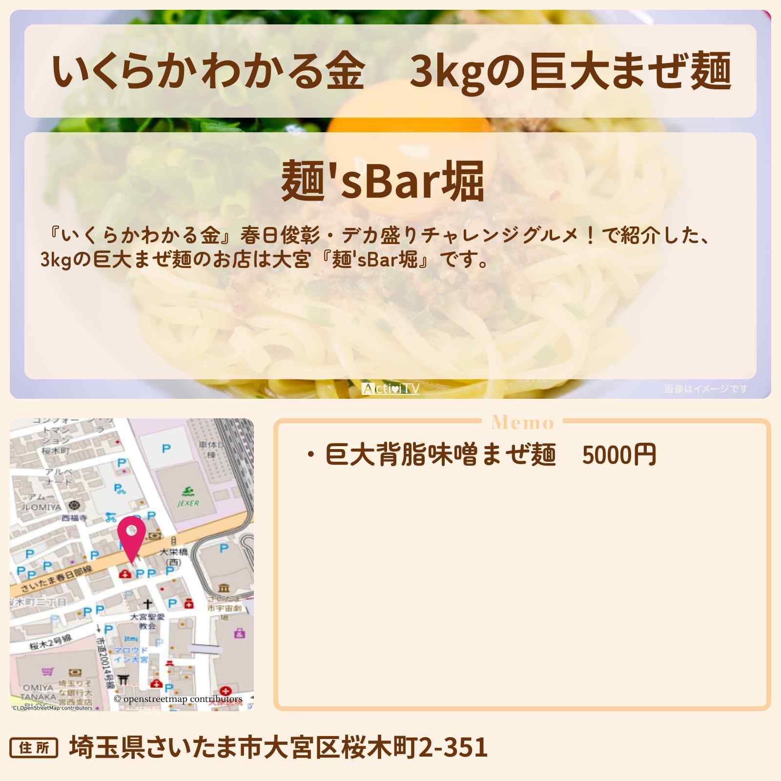 放送の【いくらかわかる金】春日俊彰・デカ盛りチャレンジグルメ!で紹介した、3kgの巨大まぜ麺のお店は大宮『麺’sBar堀』です。