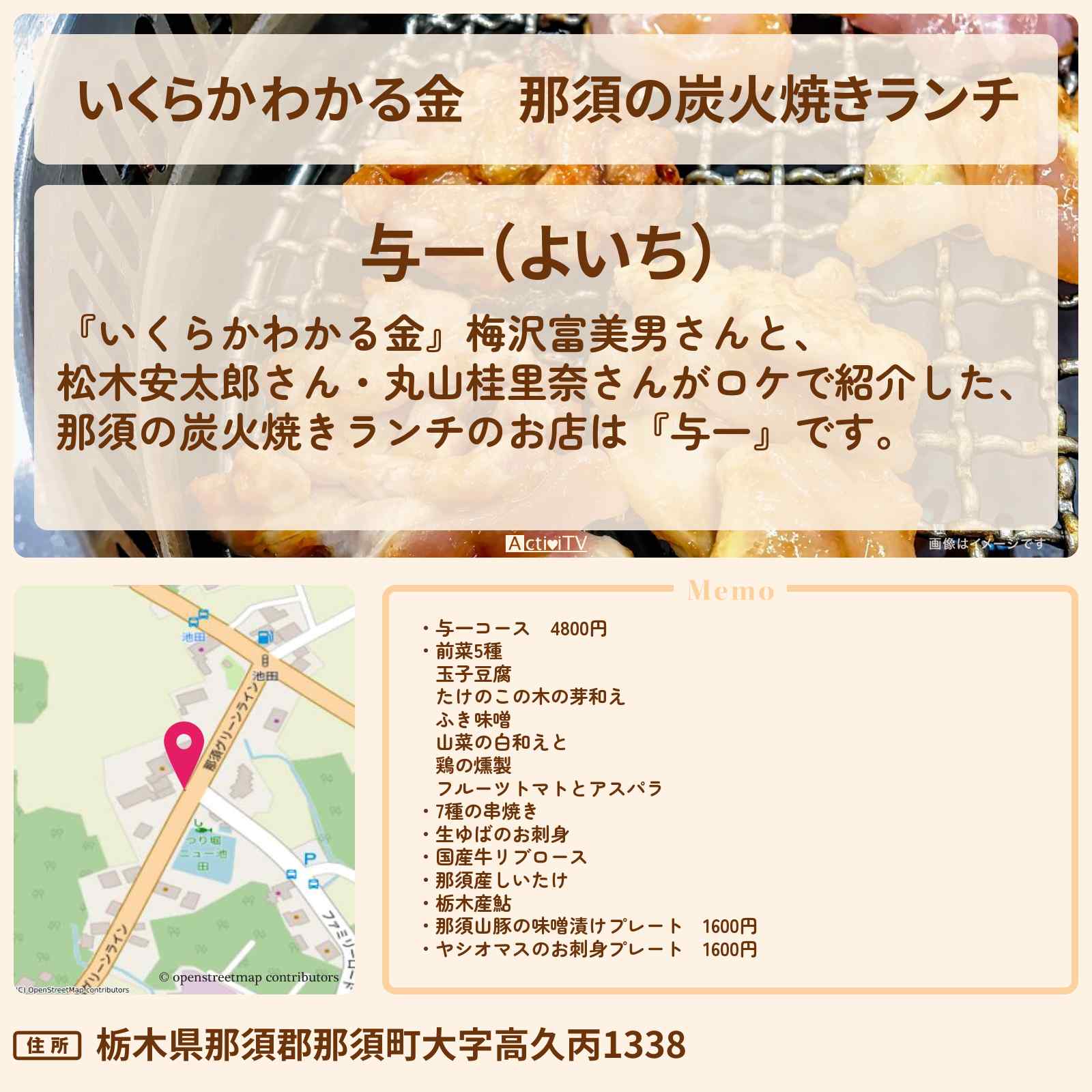 放送の【いくらかわかる金】梅沢富美男さんと、松木安太郎さん・丸山桂里奈さんがロケで紹介した、那須の炭火焼きランチのお店は『与一』です。
