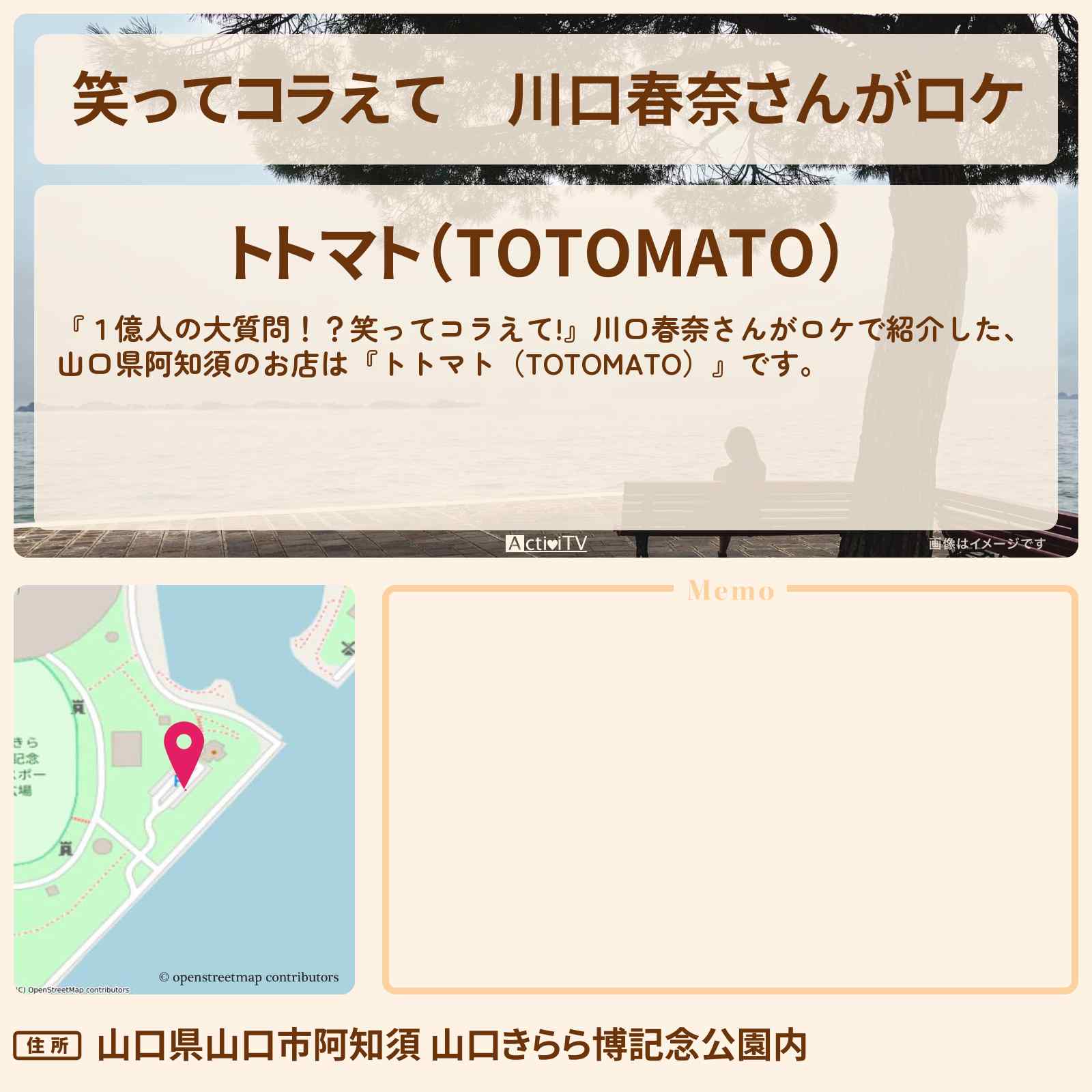 こちらは『TOTOMATO(山口市/カフェ)』のお店ページです。実名でのオススメが3件集まっています。Rettyで食が好きなグルメな人たちからお店を探そう!…