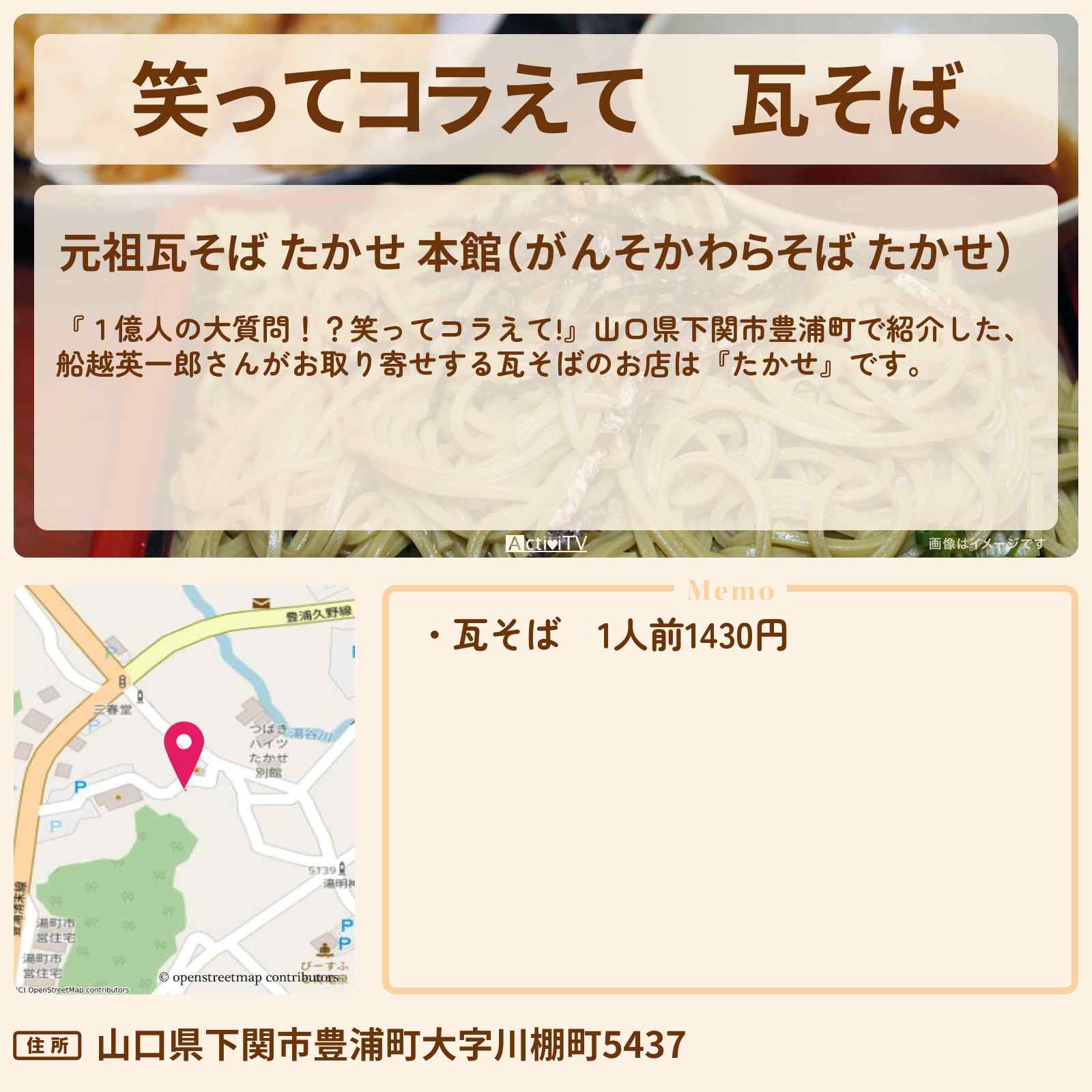 瓦そば 川棚温泉駅「元祖瓦そば たかせ 本館(がんそかわらそば たかせ)」