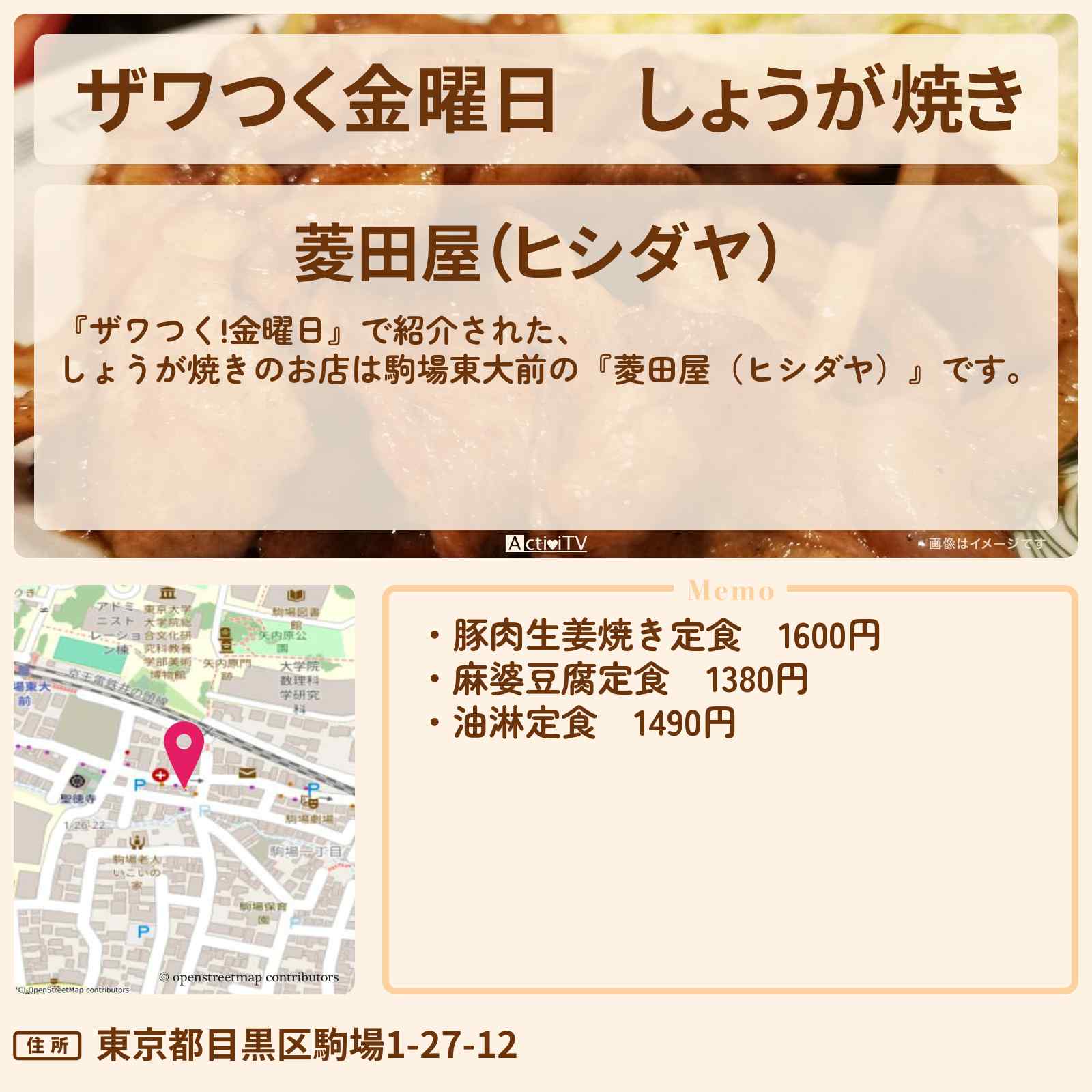 放送の【ザワつく!金曜日】で紹介された、しょうが焼きのお店は駒場東大前の『菱田屋(ヒシダヤ)』です。