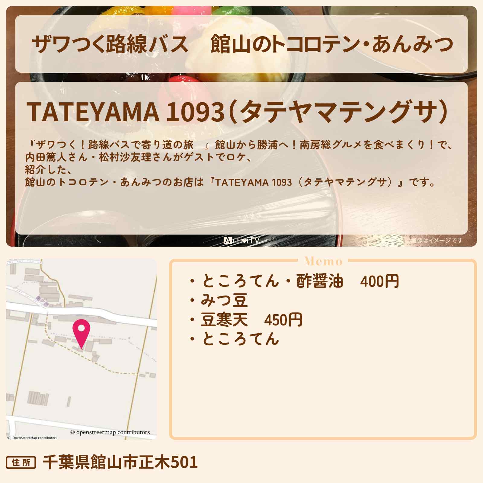 放送の【ザワつく!路線バスで寄り道の旅 】館山から勝浦へ!南房総グルメを食べまくり!で、内田篤人さん・松村沙友理さんがゲストでロケ、紹介した、館山のトコロテン・あんみつのお店は『TATEYAMA 1093(タテヤマテングサ)』です。