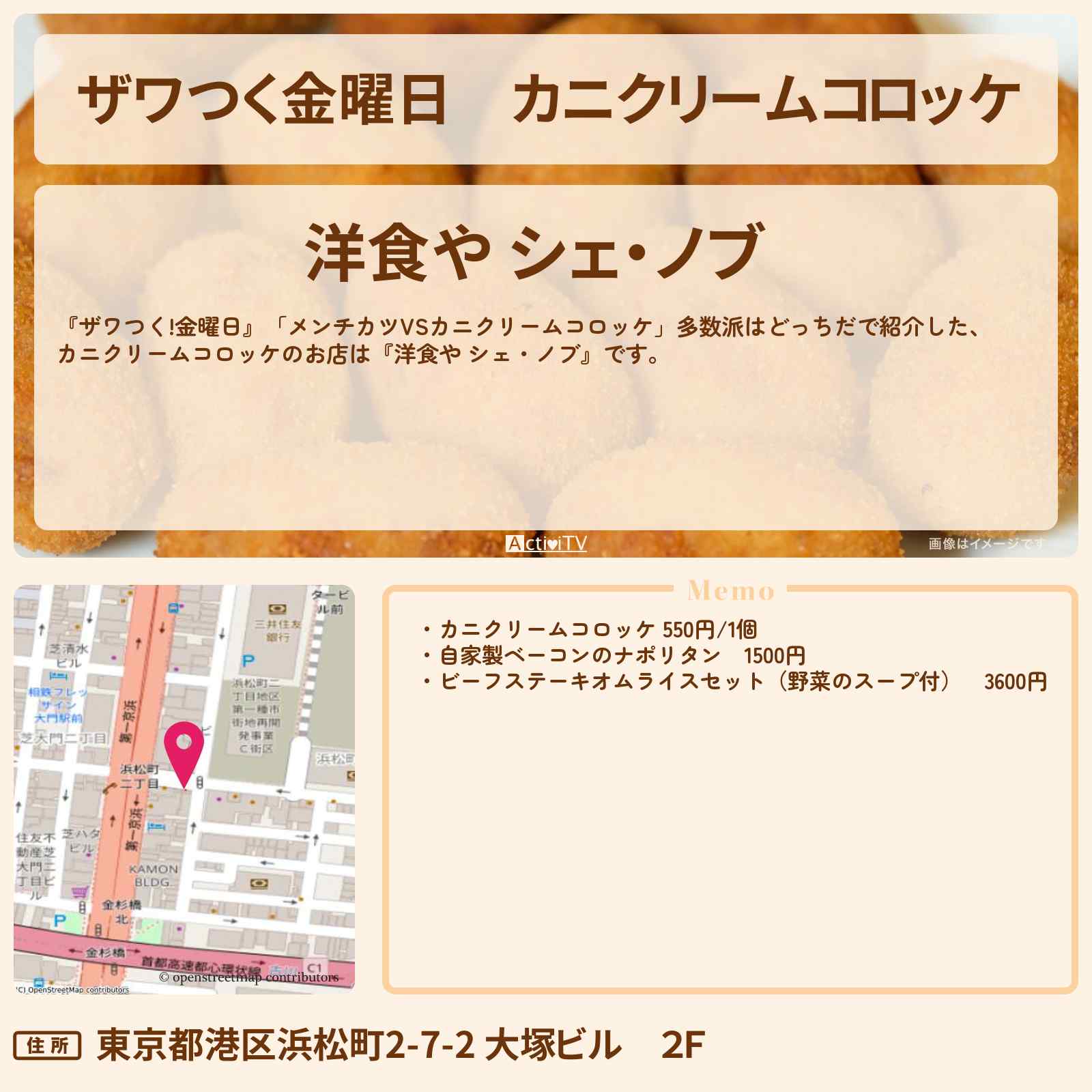 放送の【ザワつく!金曜日】「メンチカツVSカニクリームコロッケ」多数派はどっちだで紹介した、カニクリームコロッケのお店は『洋食や シェ・ノブ』です。