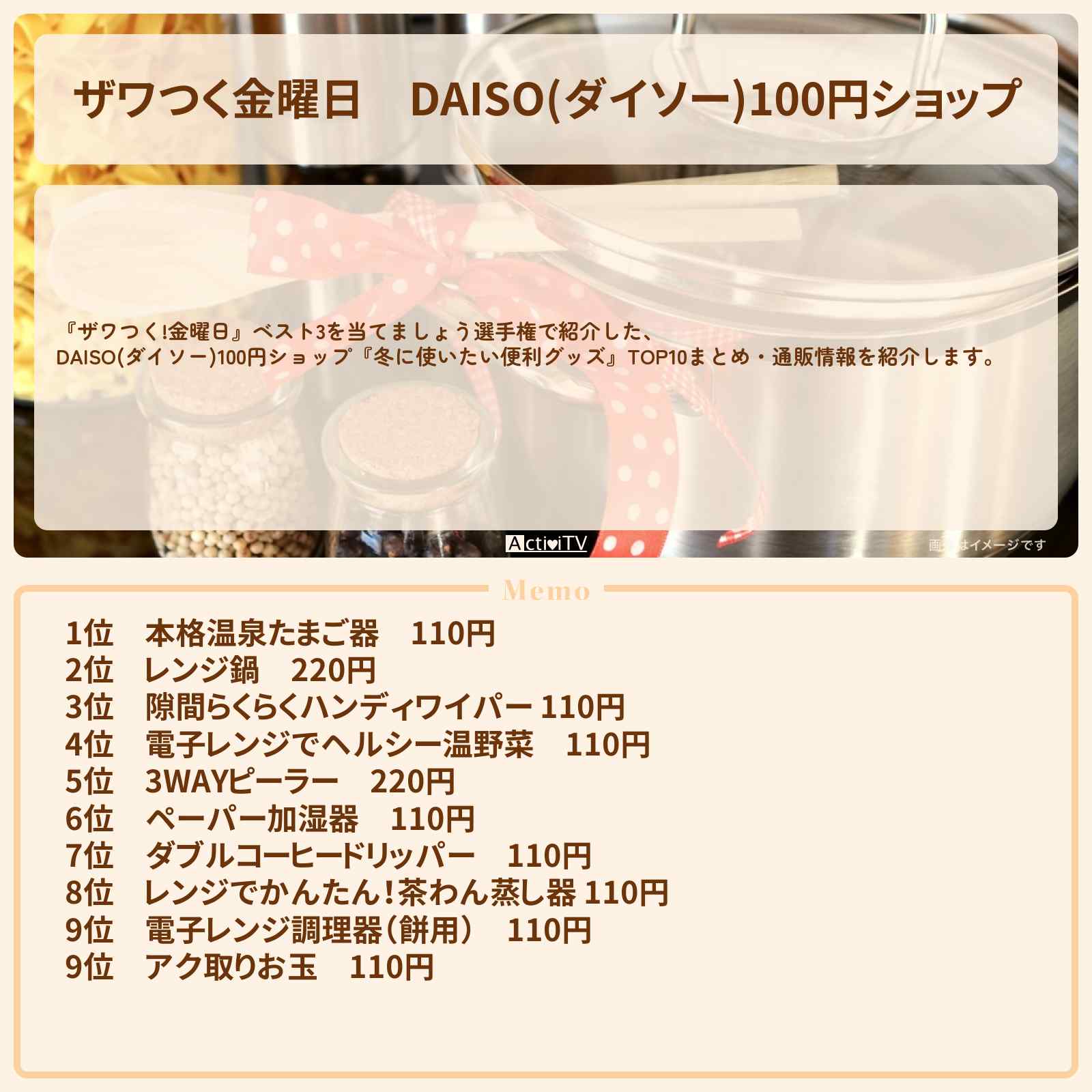 「冬に使いたい便利グッズ」トップ10からベスト3を当てる企画で、電子レンジで使える驚きの調理器や、年末の大掃除に役立つ道具などが紹介されました。1位は本格温泉たまご器でした。