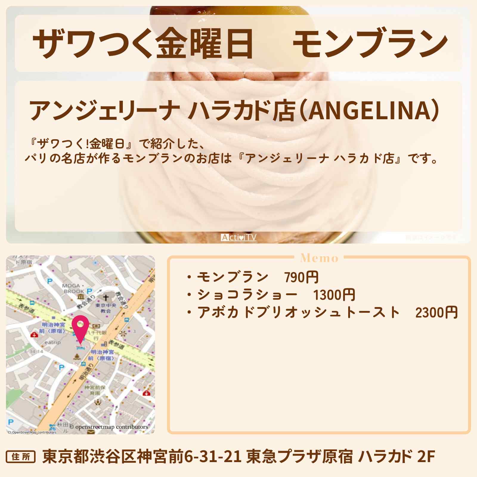 放送の【ザワつく!金曜日】で紹介した、パリの名店が作るモンブランのお店は『アンジェリーナ ハラカド店』です。