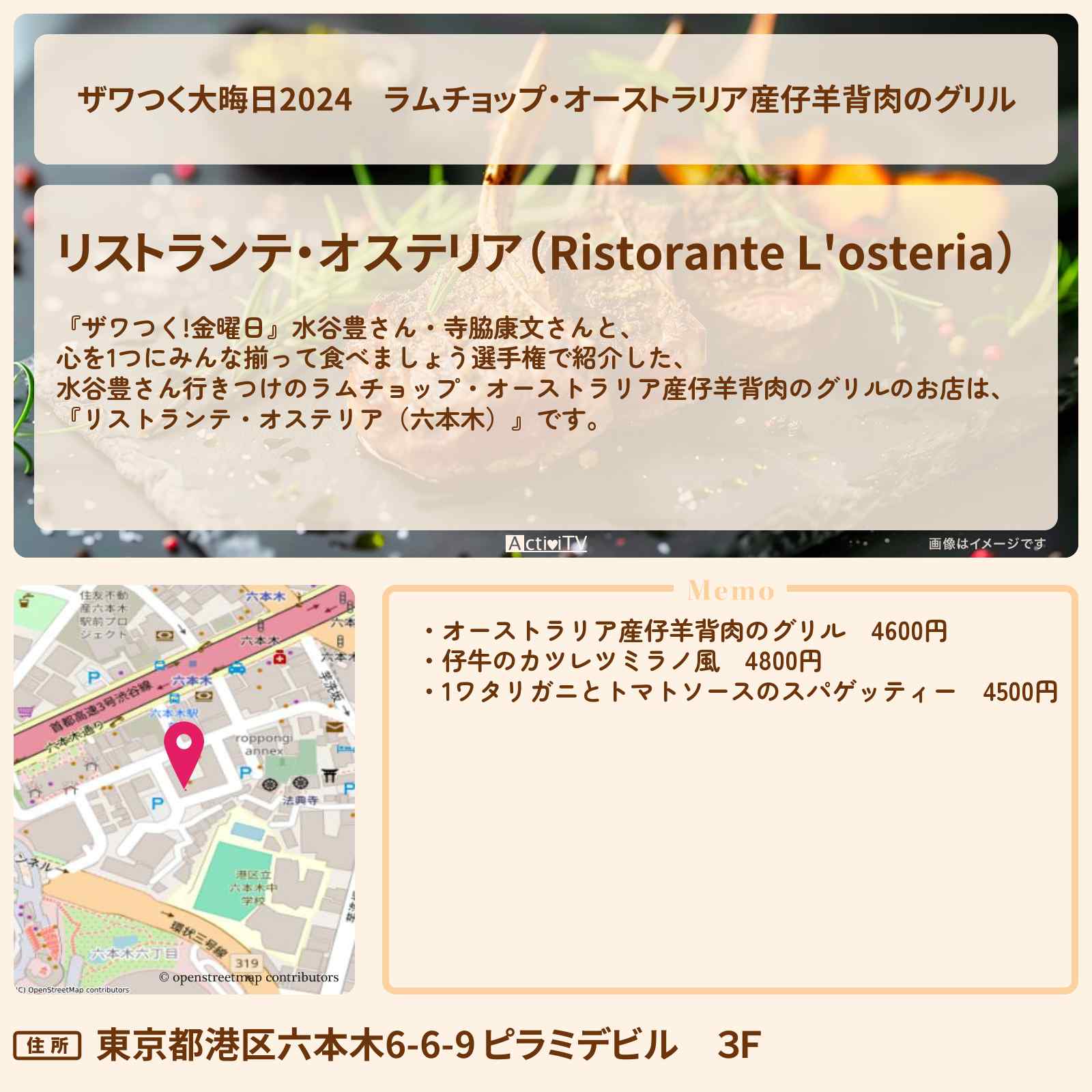 オーストラリア産仔羊背肉のグリル 六本木駅「リストランテ・オステリア(Ristorante L’osteria)」