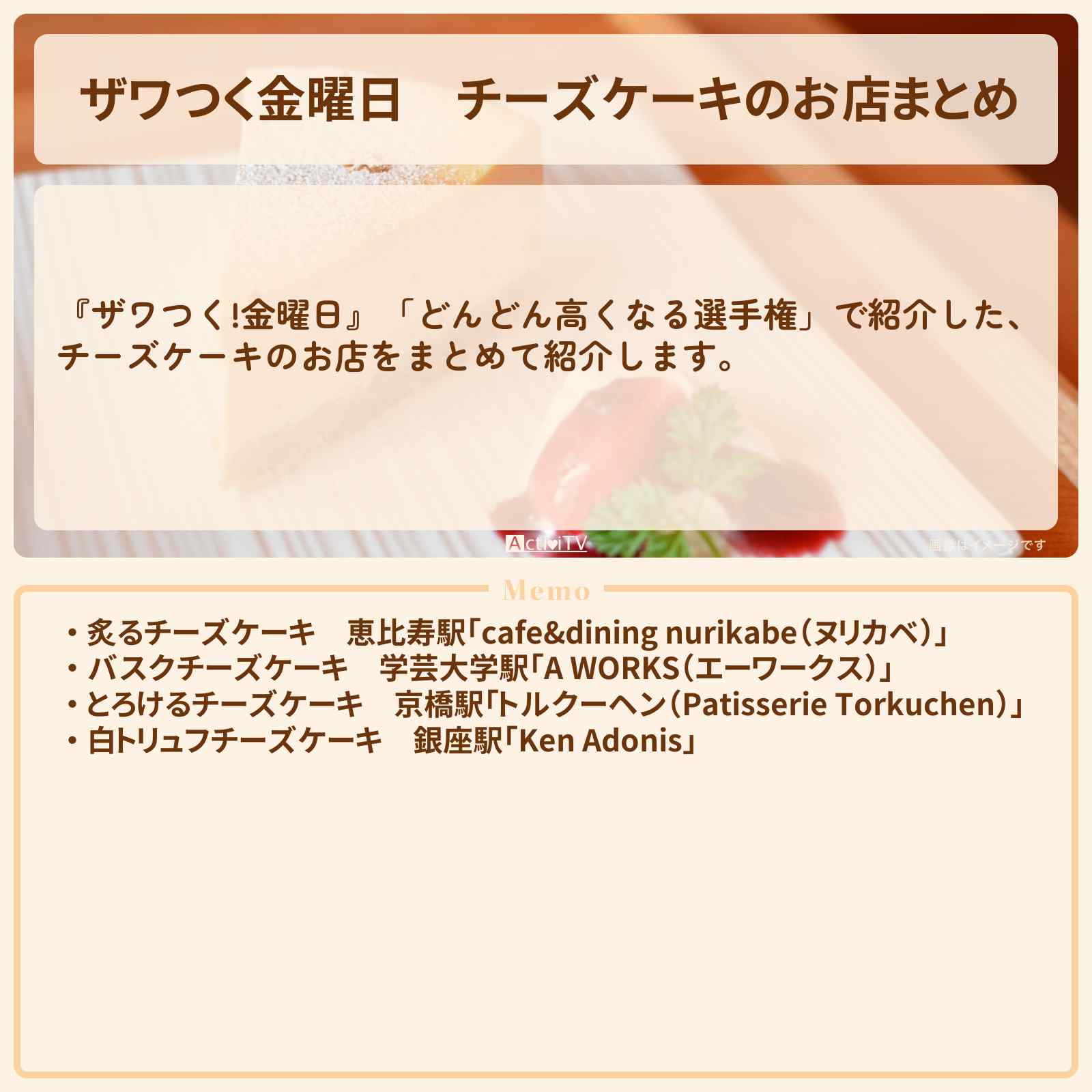 炙るチーズケーキのヌリカベ、月に3日営業の幻チーズケーキのエーワークス、高級白トリュフチーズケーキのケン アドニスなどを紹介しました。