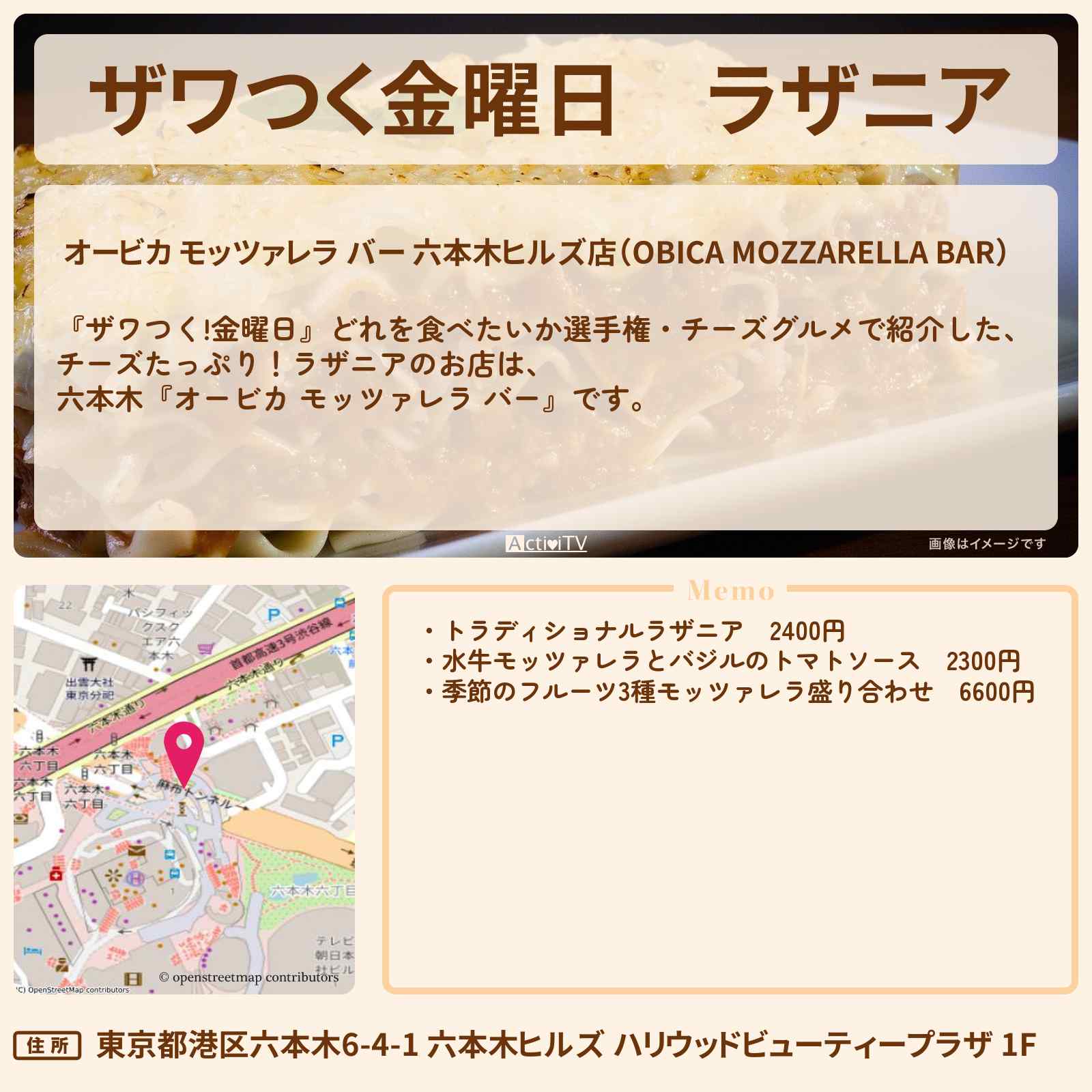 Shop Info 店舗名 オービカ モッツァレラバー 六本木ヒルズ店 住所 〒106-0032東京都港区六本木6-4-1 六本木ヒルズ ハリウッドビューティープラザ 1F アクセス ・東京メトロ日比谷線六本木駅1C出口より徒歩3分・都営大江戸線六本木駅3番出口より徒歩3分 電話番号 TEL:050-1807-6995 営業時間 11:00~23:00(L.O.22:00) 駐車場 共有2762台 クレジットカード VISA、MASTER、UC、DC、Diners Club、American Express、JCB、NICOS、SAISON、Union Pay 商品券 ジェフグルメカード 備考 wifi完備テラス席ワンちゃんOK バ…