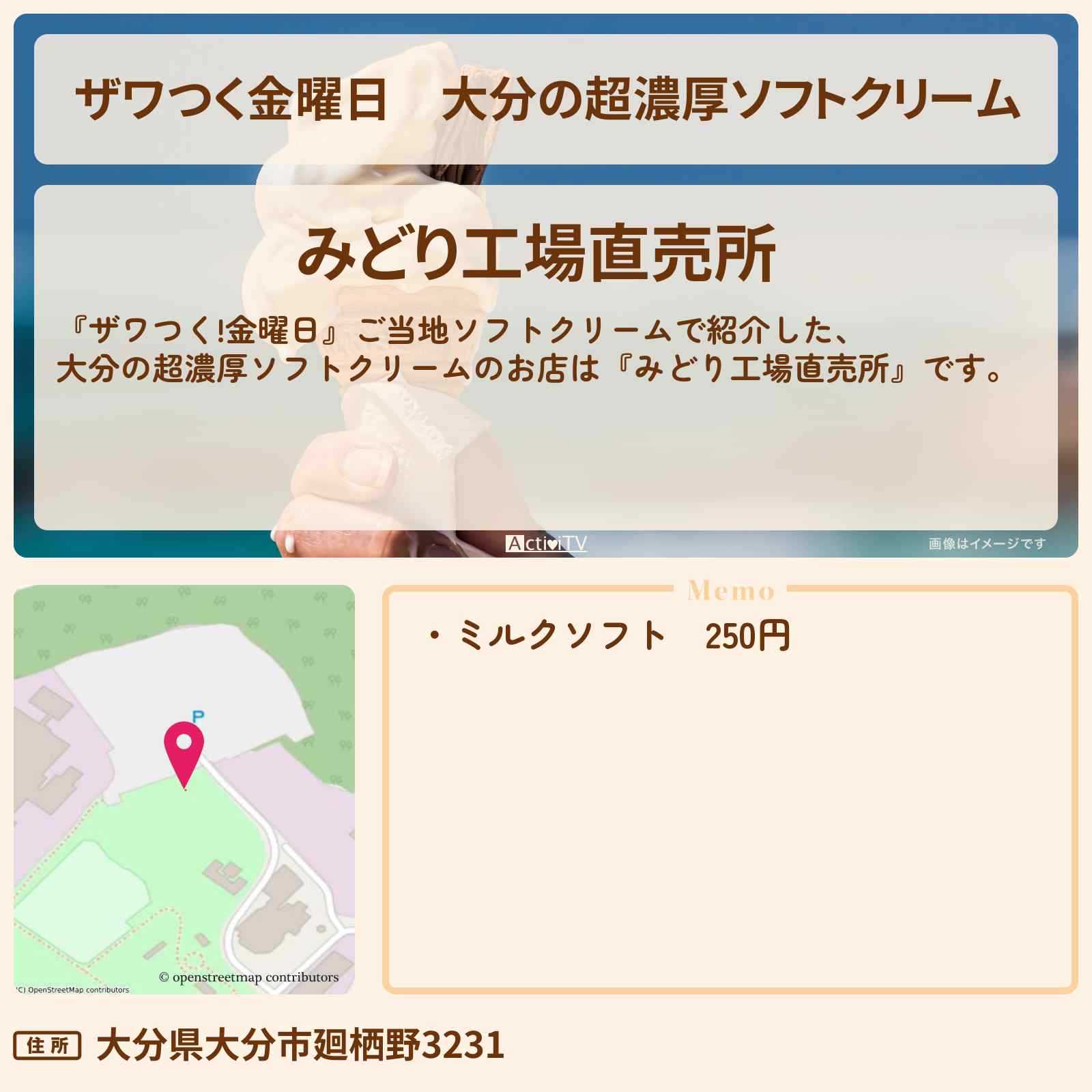 放送の【ザワつく!金曜日】ご当地ソフトクリームで紹介した、大分の超濃厚ソフトクリームのお店は『みどり工場直売所』です。