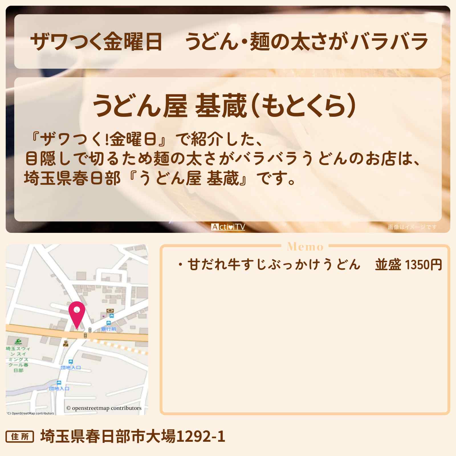 こちらは『うどん屋 基蔵(春日部/うどん)』のお店ページです。実名でのオススメが7件集まっています。Rettyで食が好きなグルメな人たちからお店を探そう!…