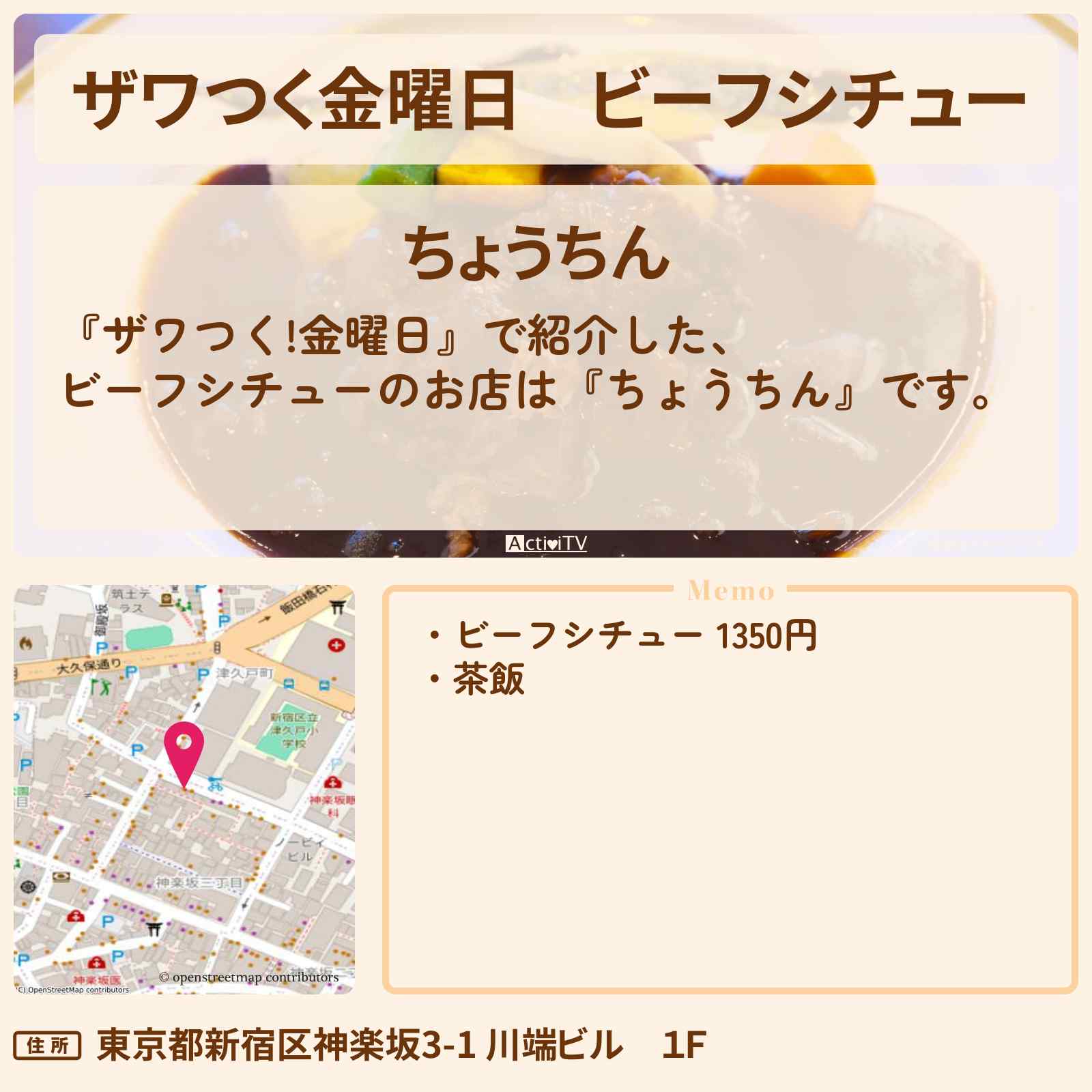 放送の【ザワつく!金曜日】で紹介した、ビーフシチューのお店は『ちょうちん』です。
