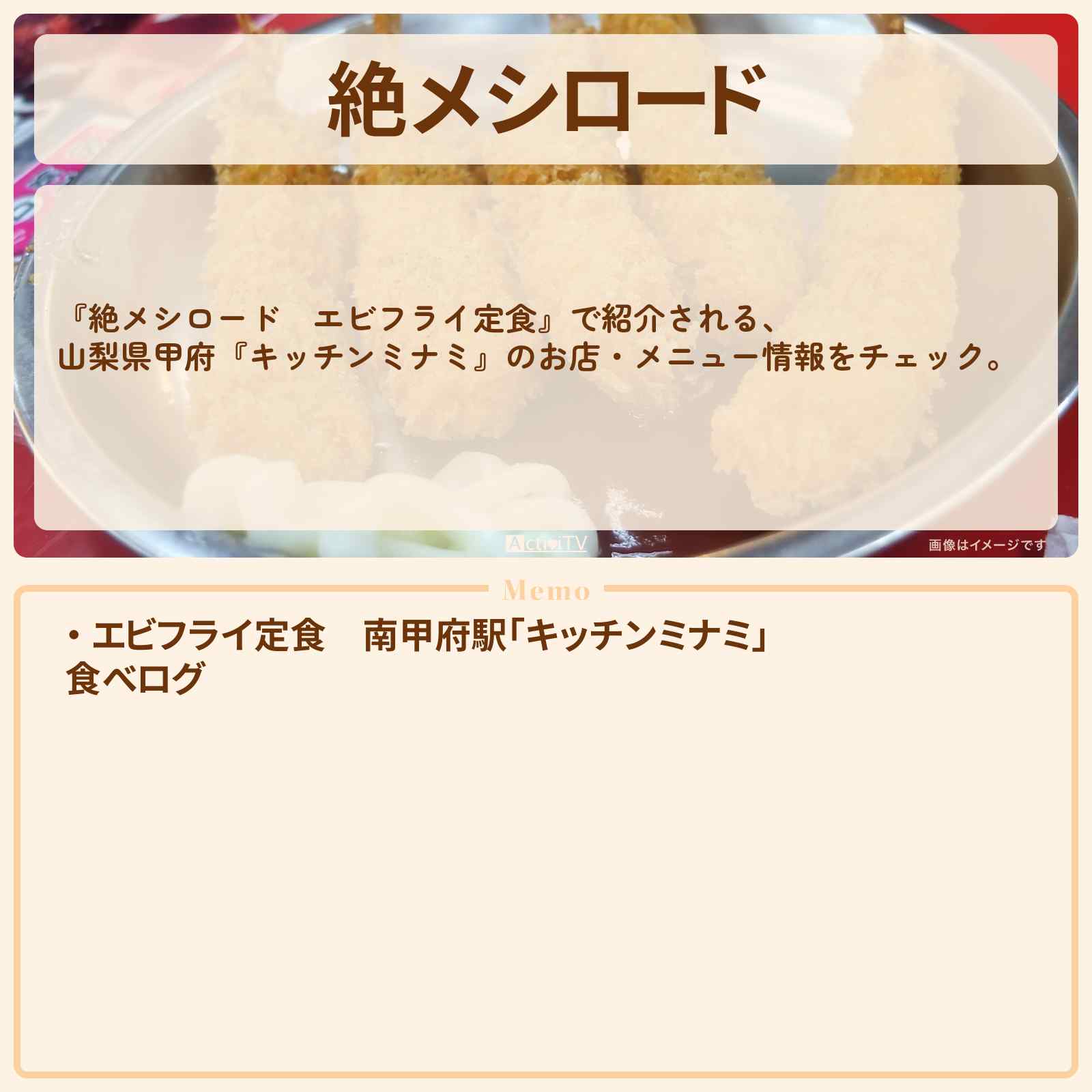 2022年9月16日放送の【絶メシロード エビフライ定食】で紹介される、山梨県甲府『キッチンミナミ』のお店・メニュー情報をチェック。