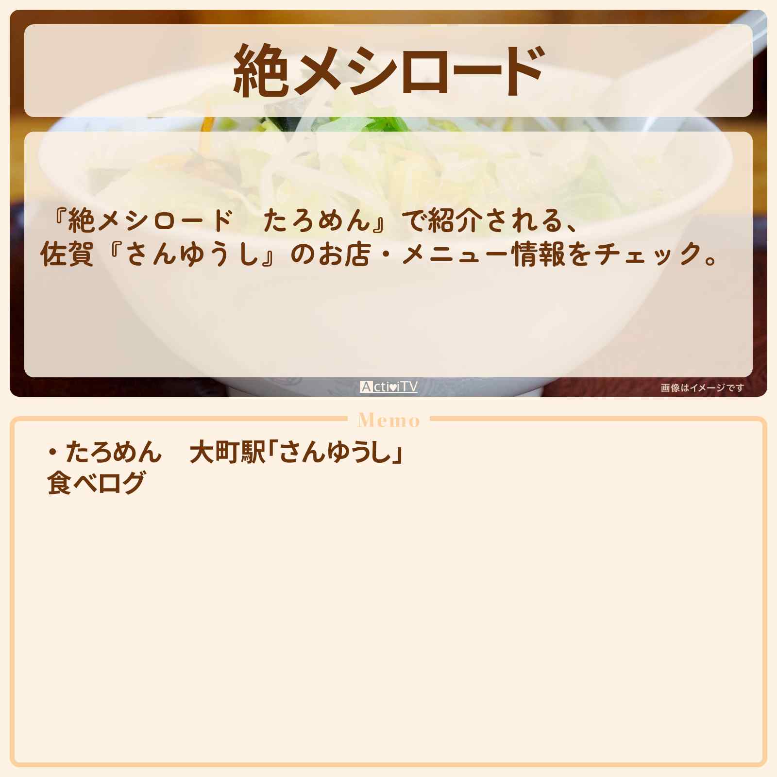 2023年3月2日放送の【絶メシロード たろめん】で紹介される、佐賀『さんゆうし』のお店・メニュー情報をチェック。