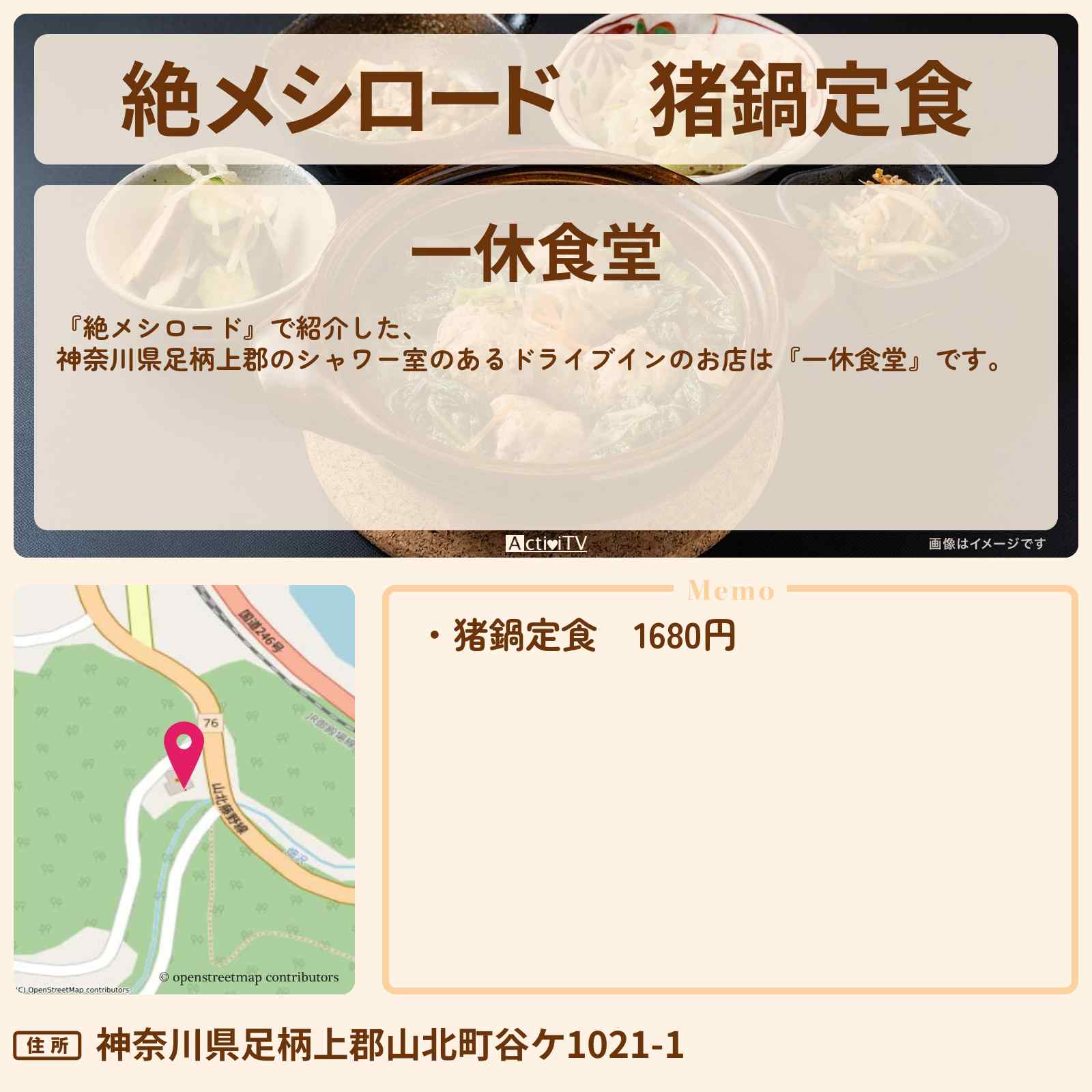 放送の【絶メシロード】で紹介した、神奈川県足柄上郡のシャワー室のあるドライブインのお店は『一休食堂』です。